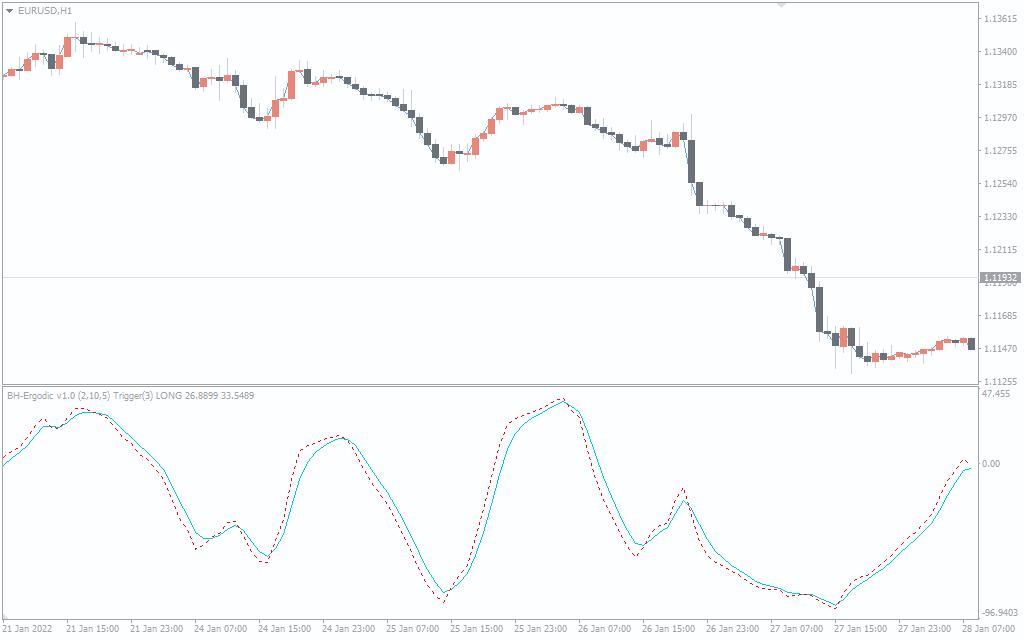 Add the BH Ergodic indicator to the chart in the MT4 terminal, it will appear in the area under the price bars as two lines.