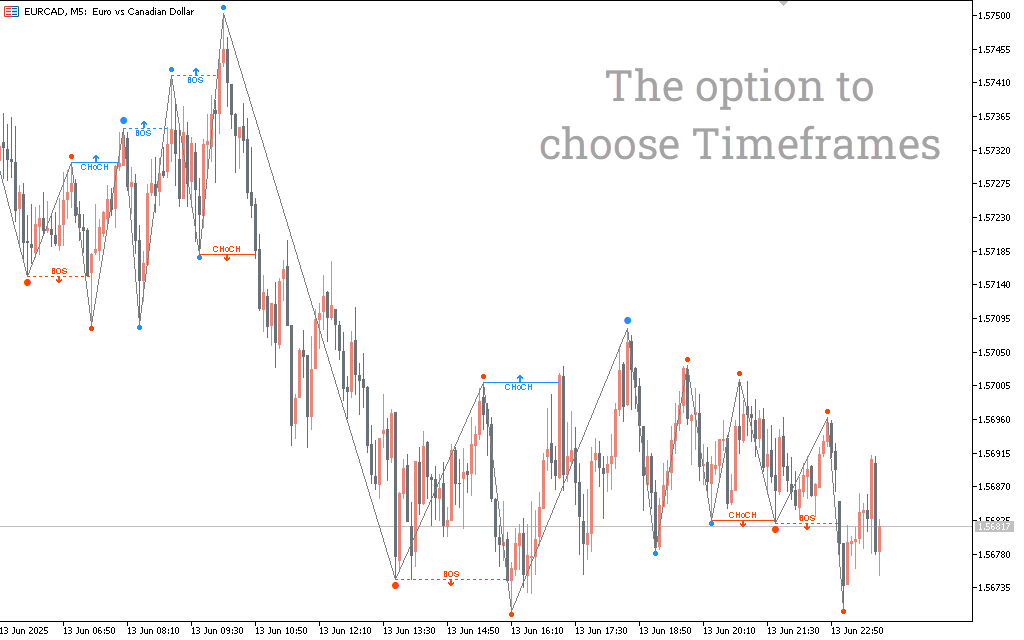 - Change of Character (CHoCH): When price breaks the opposite swing point, signaling a potential trend reversal, a solid line with a CHoCH label is plotted. This highlights critical zones for reassessing bias or entering on reversals.