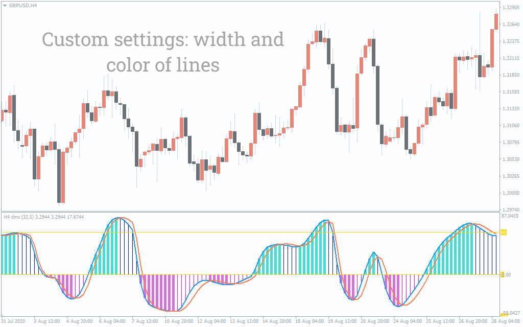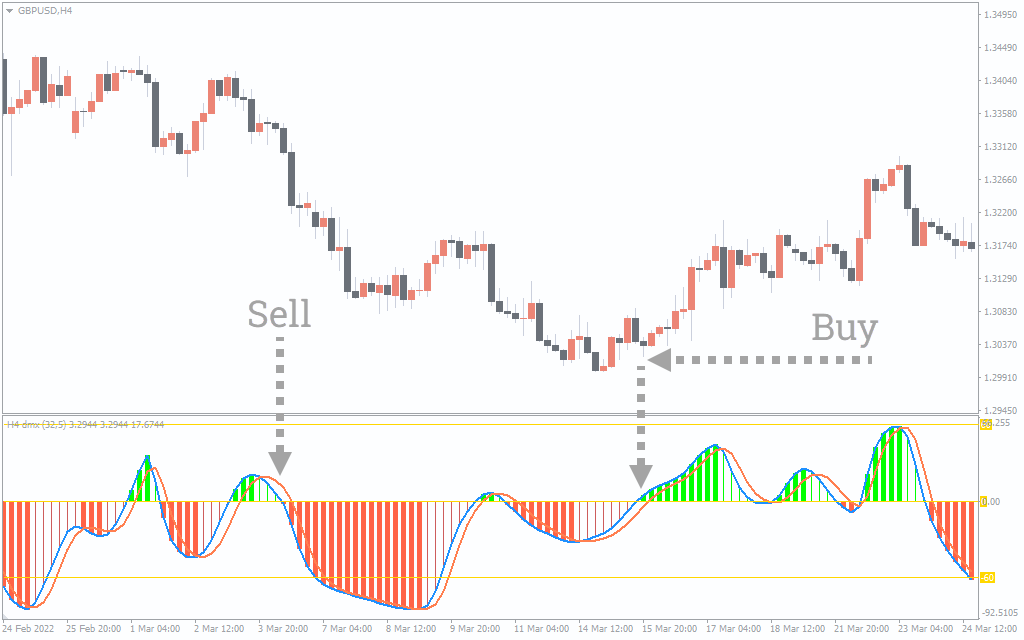 The above GBP/USD H4 chart shows BUY and SELL signals with the indicator. The DMX Jurik Histogram Indicator indicates the bearish and bullish trend oscillating in overbought and oversold territory.