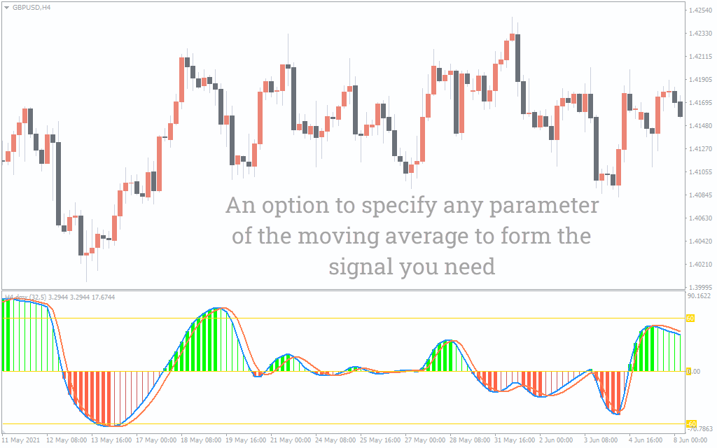 The indicator’s histogram shows red and green bars in the side window to tell the direction of the trend. The red bars mark a bearish trend, while the green bars mention a bullish trend.