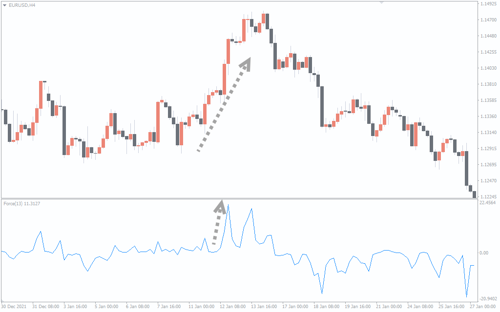 The Force Index indicates the market trend using its signal line in the oscillator window. The indicator level exceeding zero indicates a bullish trend. Oppositely, a negative force index signals the market is under a bearish trend condition.