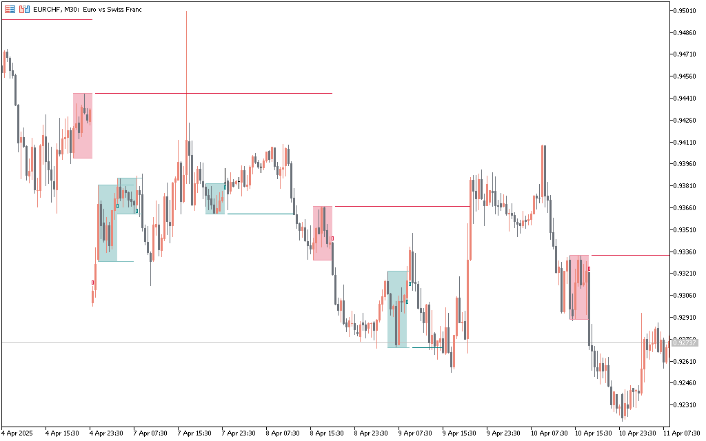 This indicator identifies potential bullish and bearish reversal zones when a specific number of candlestick patterns meet the predefined criteria within a sequence. For example, a bullish reversal may be triggered when a downward price sequence fails to make new lows and forms a recognizable bottom structure. Conversely, a bearish reversal appears when an upward move weakens over several bars, forming a top. These patterns are further validated by checking for alignment with trend filters, derived support/resistance zones, or moving average signals, helping traders confirm the setup before entry. Each signal is visually represented by colored boxes and reversal markers directly on the chart.