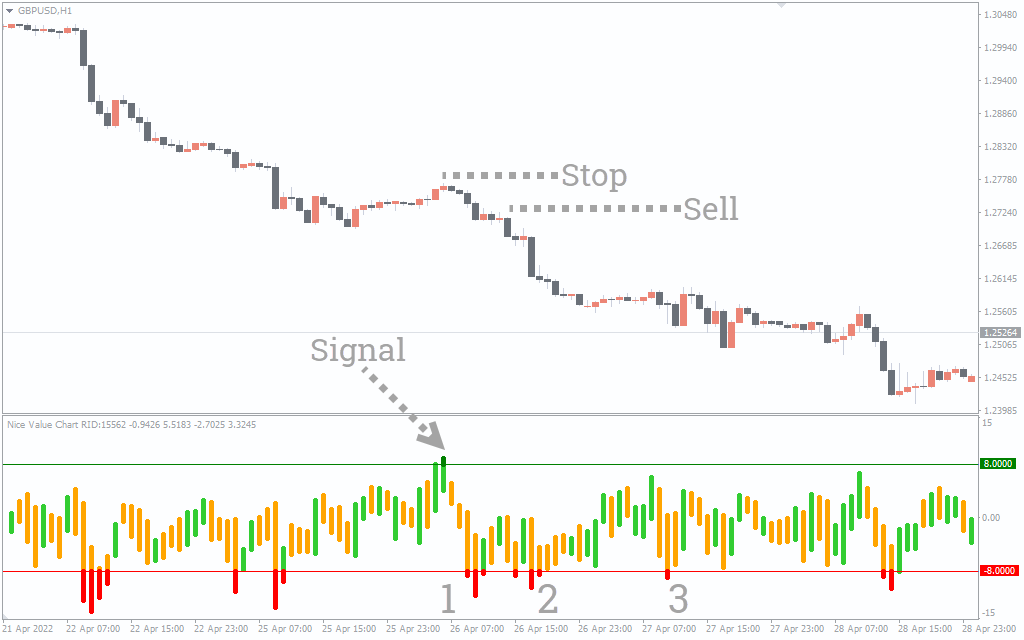 As an example in the chart below (forex market GBPUSD, 1h), the signal to sell comes when: