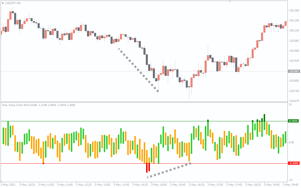 Usually the Nice Value Chart Indicator values fluctuate around zero.