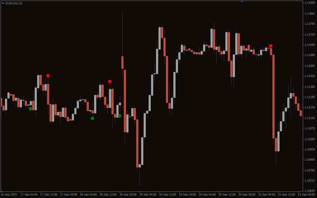 The Super Point Signal Indicator generates buy and sell signals that are displayed directly on the chart as colored dots. Green dots indicate a buy signal, suggesting a potential opportunity to enter a long position, while red dots indicate a sell signal, suggesting a potential opportunity to enter a short position.