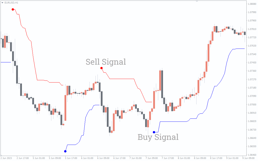 The red and blue lines are the lines of the moving average, which follows the trend, while the blue and red dots are the buy/sell signals generated by the ATR indicator. Thus, the indicator signals a buy entry zone when it paints the blue dot, while the red dot signifies a sell zone.
