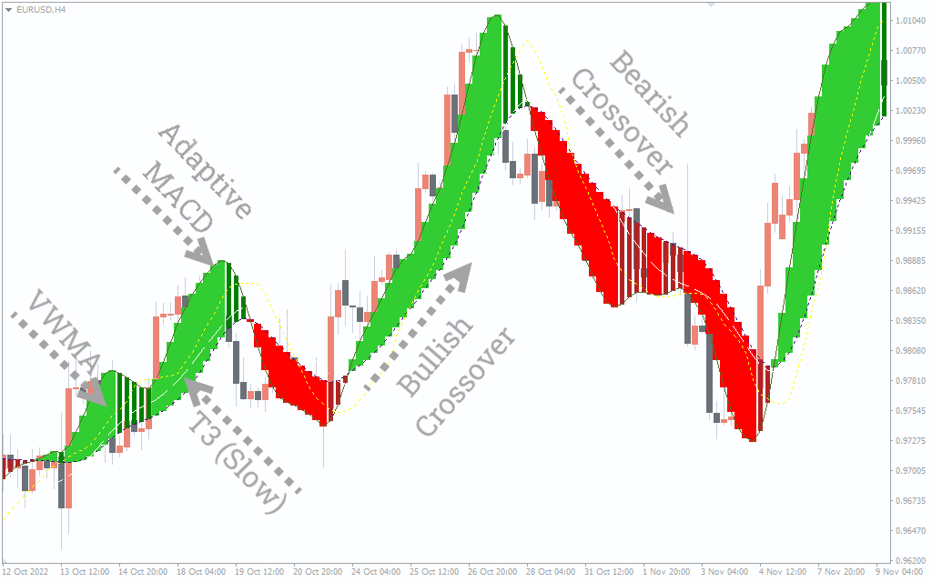 The volume-weighted moving average (VWMA) in red works as a signal line when combined with adaptive MACD. The color of MACD bars changes to green and red depending on the change in market bias.