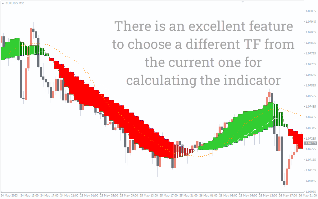 The All MACD Adaptive MTF Indicator applies three different moving averages alongside MACD on the chart to determine price trends. The dynamic support-resistance levels offered by the MAs also help traders identify possible trade entry and exit zones.