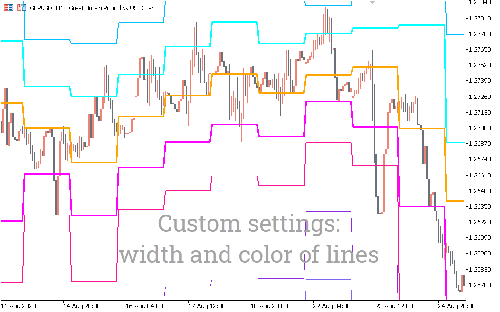 After installing the indicator on your Metatrader platform, you will see six horizontal levels plotted in the main chart window. The tree lines below show possible price support levels. On the other hand, the three upper levels represent resistance zones. These lines are updated by the indicator’s automatic turning point calculator.