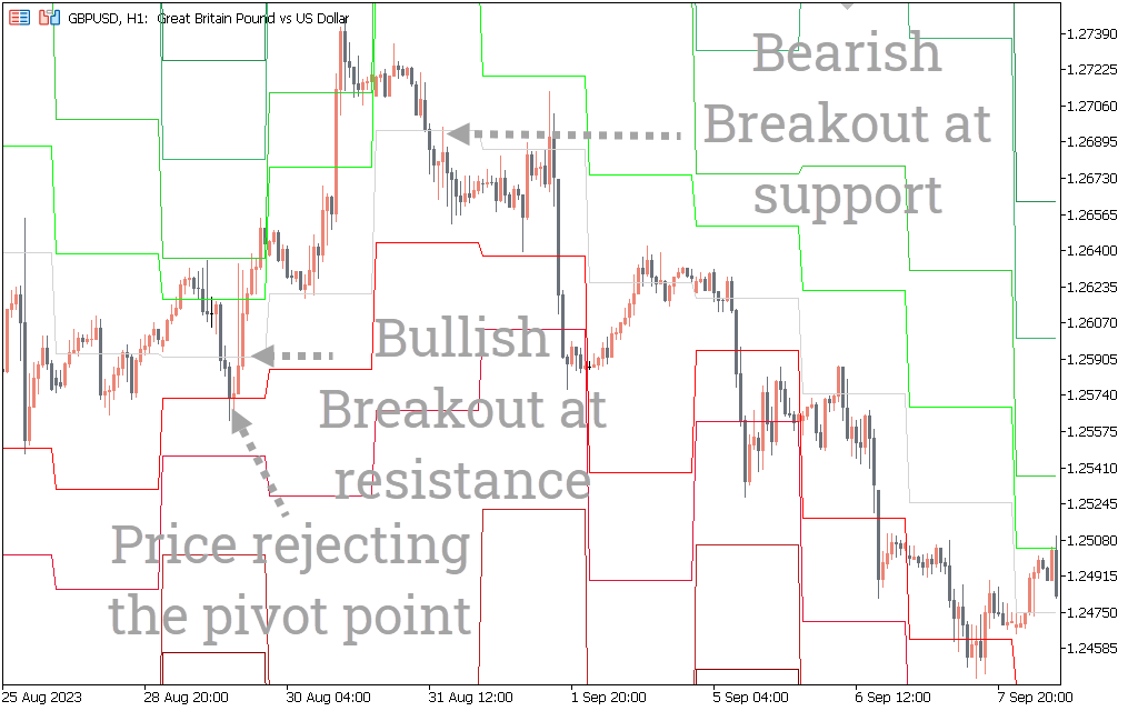 To set up a breakout, the price must break through the support or resistance level indicated by the indicator. For example, the price breaks the nearest reversal resistance, which means the market is in a bullish trend. If you enter a buy order based on a bullish breakout at a pivot point, then target the next resistance level as a profit-taking zone.