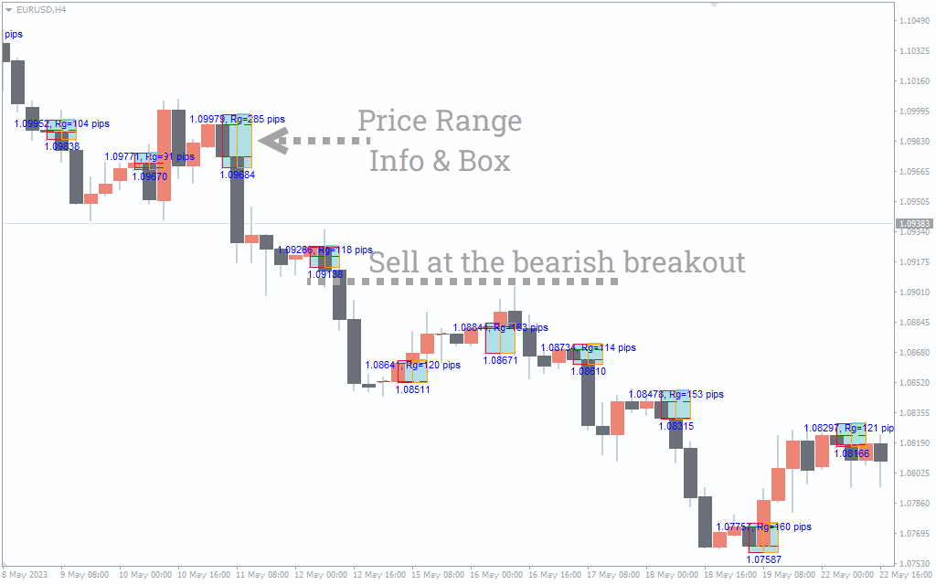 The Asian Breakout Range indicator shows the price range (in pips) in text formats on the chart. Also, it plots colored boxes to outline the potential price breakout zone.