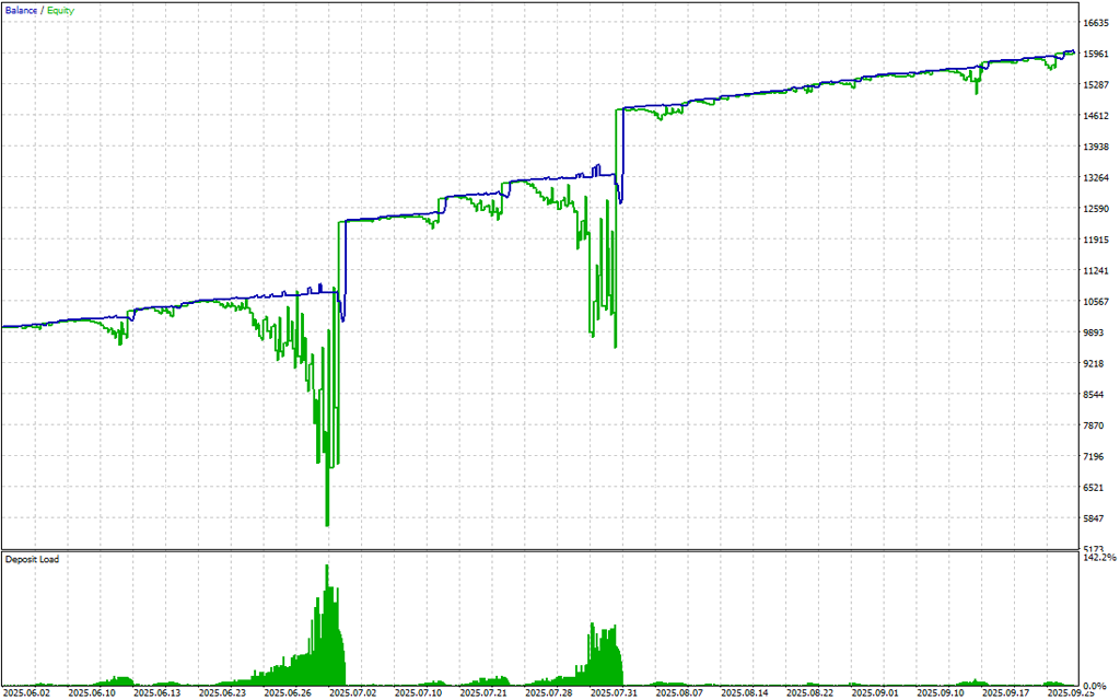 The equity curve shows steady growth with brief drawdown recovery phases, typical for advanced grid EAs. What makes it stand out is how effectively it rebounds from drawdowns — due to controlled lot progression and timely basket exits.