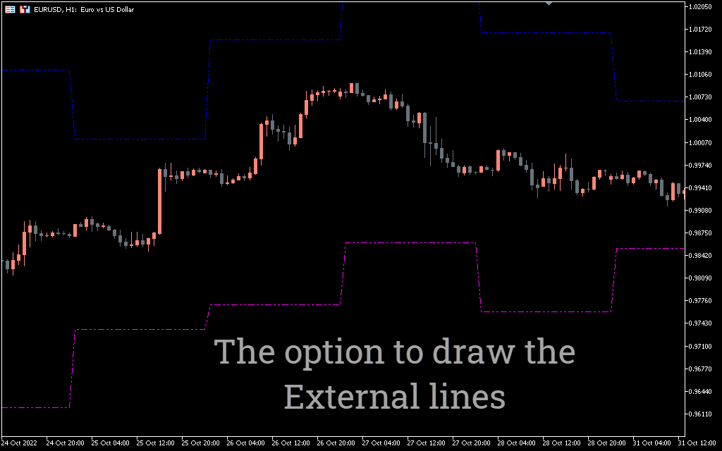 The above EURUSD H1 candlestick chart shows the Daily Pivot Points for MT5 indicator in action. Typically, the indicator draws a support line in blue, support lines in green, and resistance lines in red. In addition, the indicator places dotted lines between support and resistance as midlines.