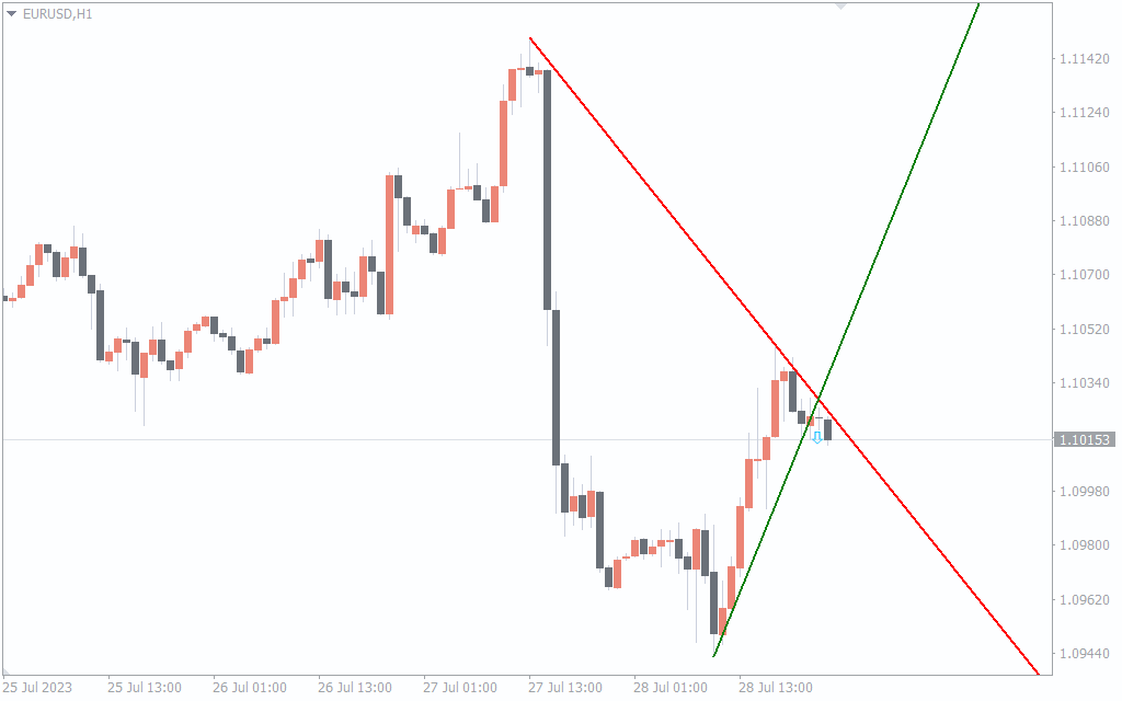 The trading strategy of this indicator is simple. If the price breaks the upper trend line traders should place a sell trade. Oppositely, if the price breaks the down trend line traders should enter the market with a buy position.
