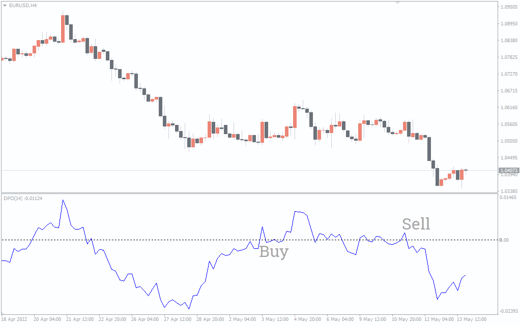A buy signal occurs when the DPO line crosses below the signal line, while a sell signal occurs when the DPO line crosses above the signal line.