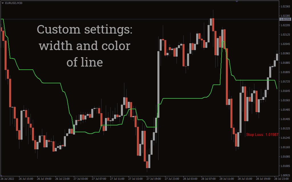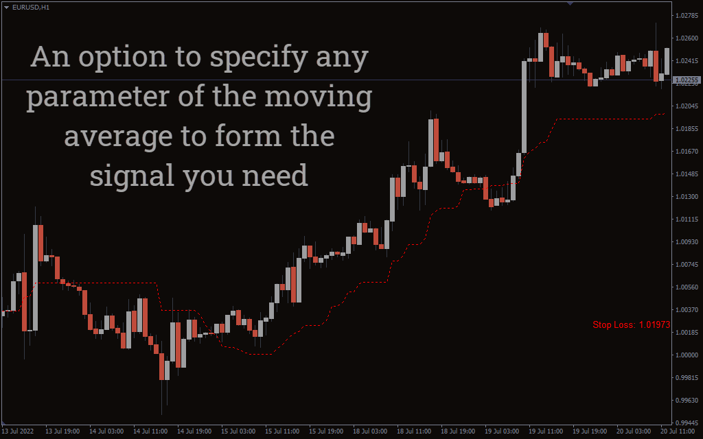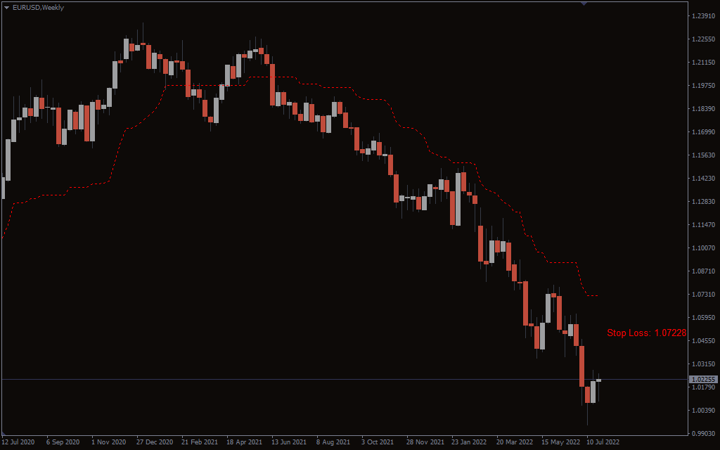 The price action of EURUSD illustrates the Doda Donchian indicator in action. Notice how the price sustains a downward movement after the price crosses below the indicator line.