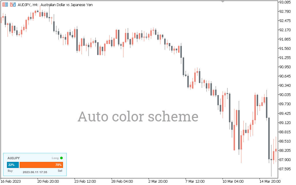 Since the indicator is compact and its color scheme is quite pleasant, it will not be too conspicuous. But it will also be easy to find it on the MT5 terminal chart if necessary. As a result, due to its convenient display and efficiency of use, the market sentiment indicator can be useful for both beginners and professional traders.