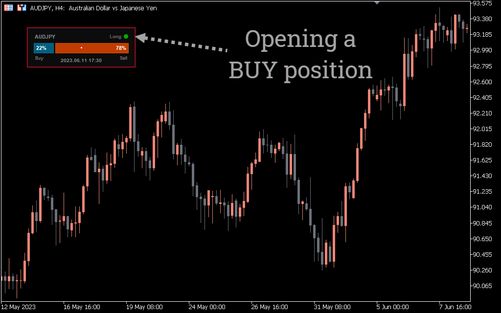 In the example above, the open positions indicator shows that the number of open sell trades is greater than the number of buy trades – 62% versus 38%, respectively.