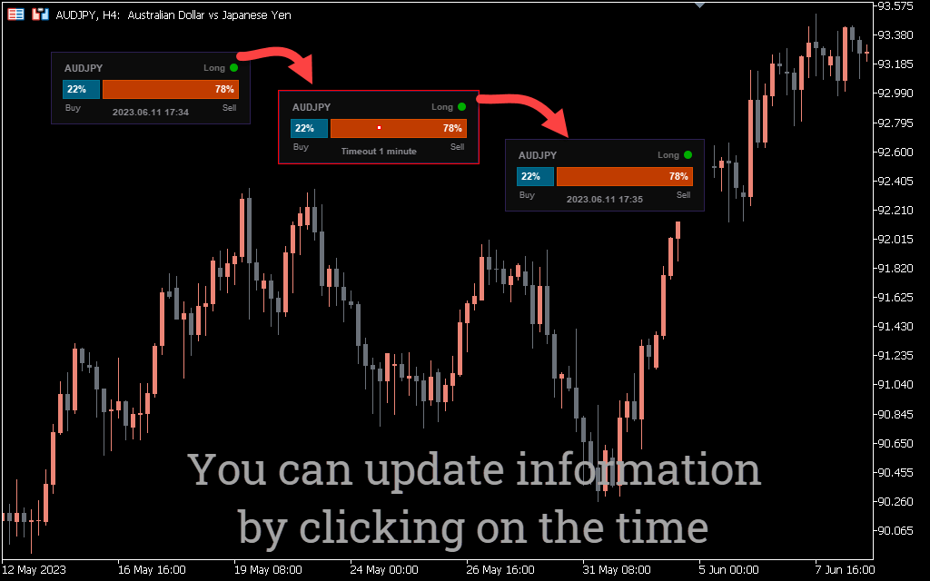 By keeping the indicator updated every 5 minutes, when trading on the M1-M5 timeframes, you can “feel the pulse of the market”. This will help you instantly respond to changing buyer-seller ratios.