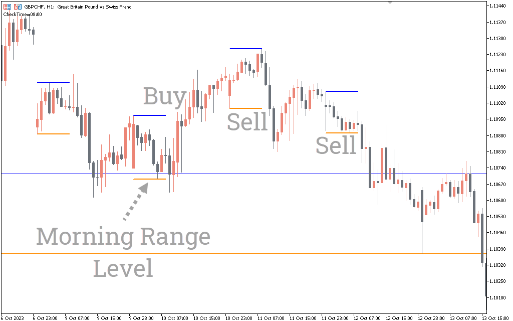 Thus, a buying opportunity is signaled when price breaks the high of the morning range. Similarly, a forex trader may be looking to sell an asset if the price moves beyond the low of the morning range.