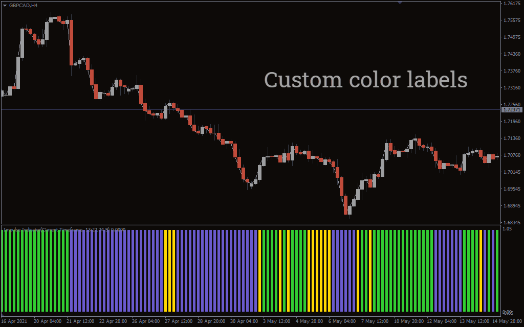 The chart shows price movement for the Great Britain pound against the Canadian dollar. When the price is nose diving the chart posts red candlesticks. The indicator confirms the downtrend by posting red bar graphs. However, the downtrend dwindles and the indicator posts a deep sky blue bar. This signifies an impending price reversal. You should exit the trade. In fact, the indicator posts green bars indicating a start of a bullish trend. The prices rise as shown by the blue candlesticks.