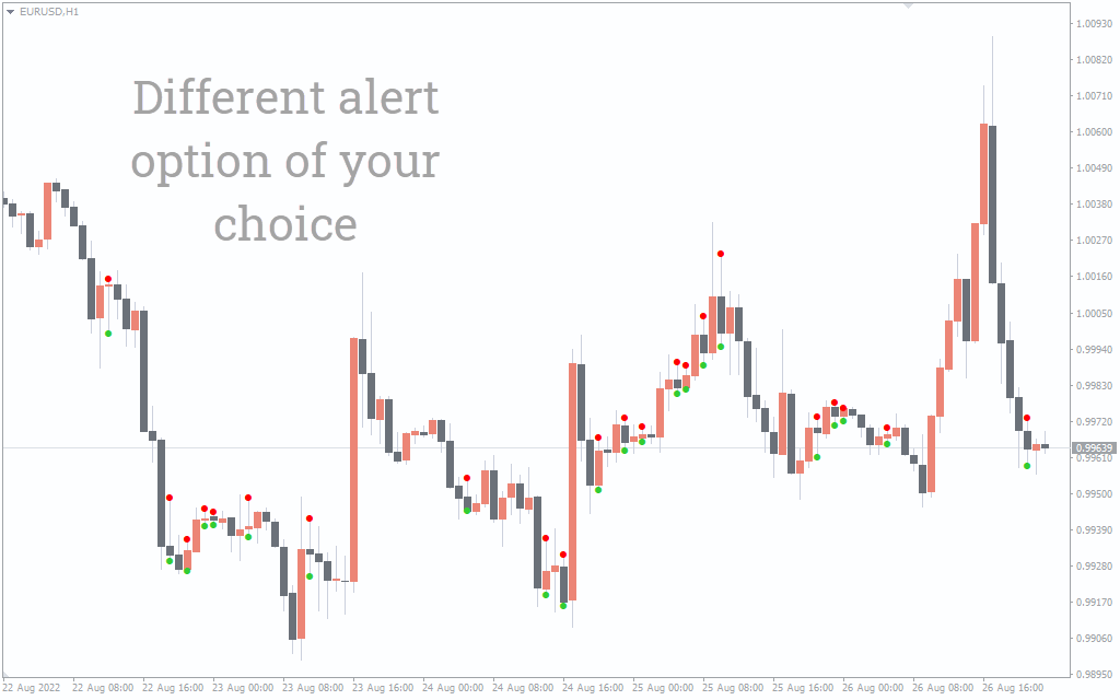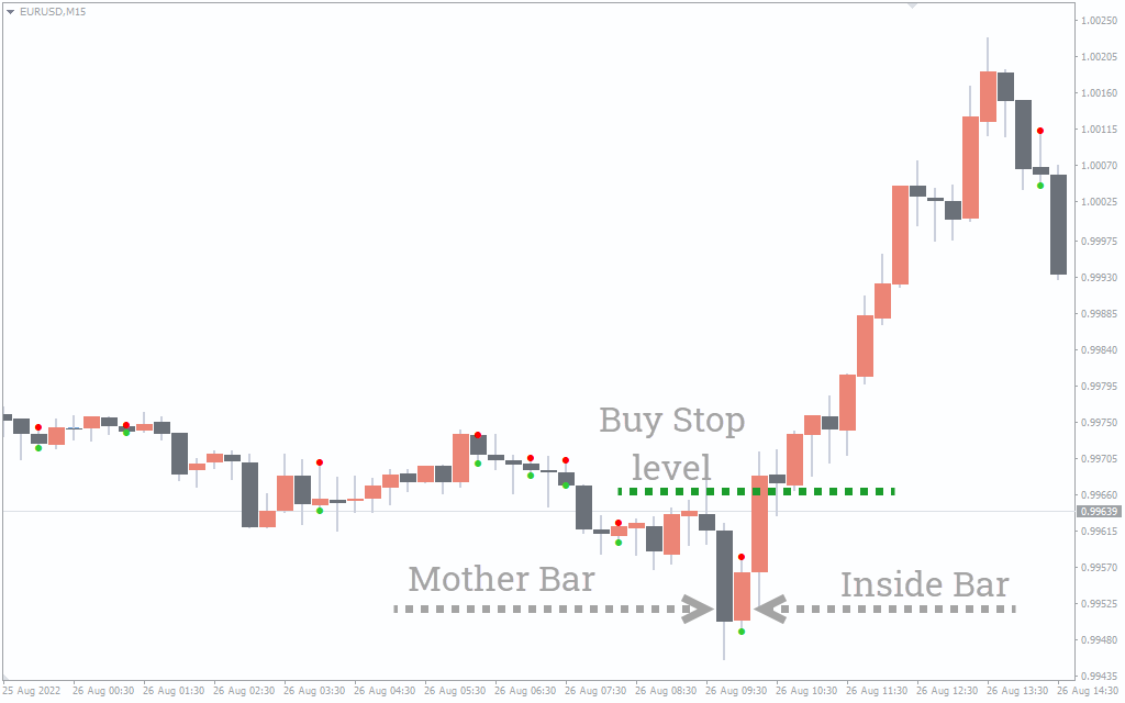 Essentially, the indicator does the donkey work of identifying the inside bar. You only need to place a buy-stop trade above the high of the mother bar or a sell stop below the low. The best part is that the indicator alerts you when the insider bar forms. The low of the inside bar is indicated by a green dot, while a red dot indicates the high.