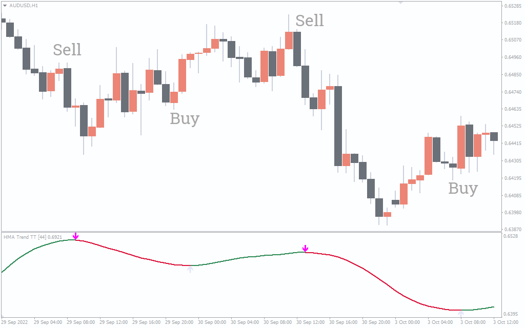 The above AUDUSD H1 candlestick price chart shows the MegaTrend HMA indicator for MT4 in action. Additionally, traders can enable the display of the HMA and the arrow signals if necessary in the separate indicator window.