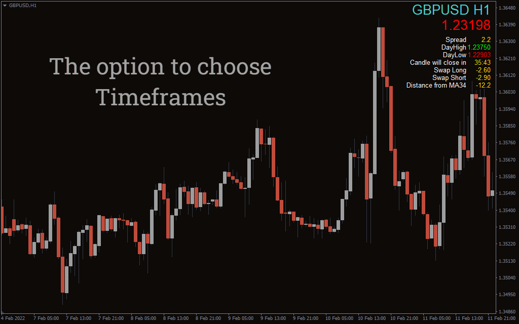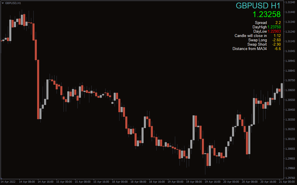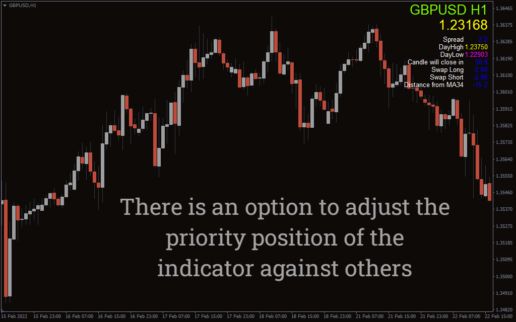 The swap for long and short positions of the chart currency pair helps traders using arbitrage traders. Another feature is the indicator display that shows the distance of the current price from the moving average of a predefined value. However, traders can custom input the value for moving average calculation using the indicator settings.