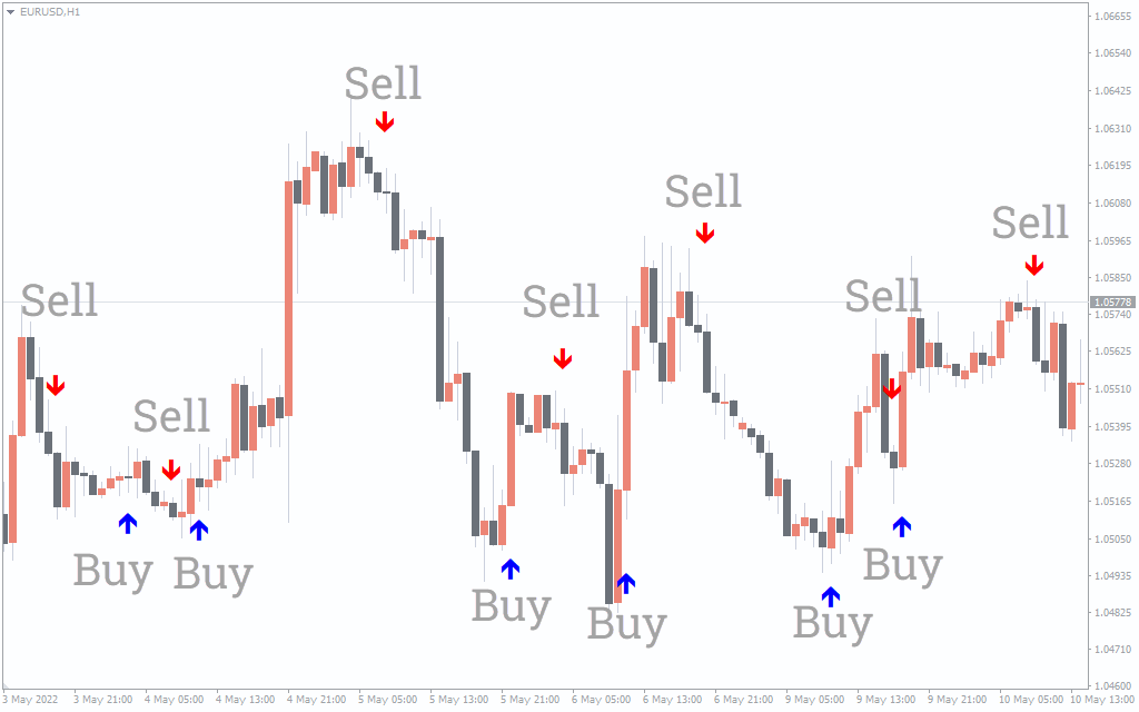 The above EURUSD H1 candlestick price chart shows the mindhero indicator for MT4 in action. The indicator plots the bullish trading signals in Blue arrows and shows the bearish forex trading signals using the Red arrows.
