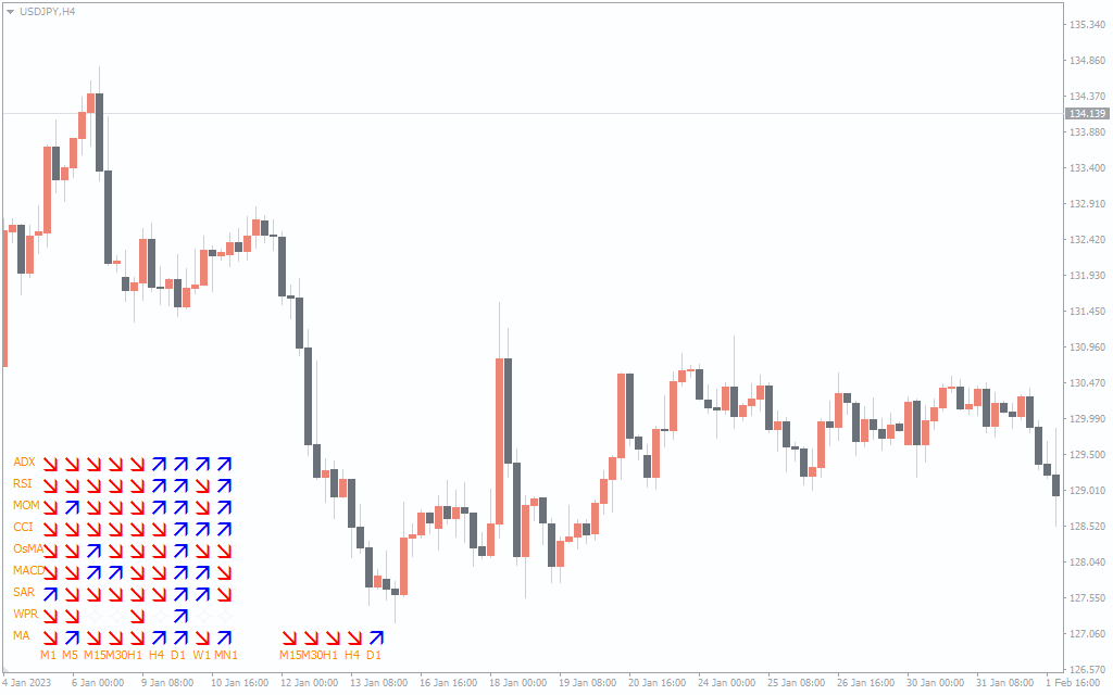 The Multi Trend Signal Indicator is an MT4 indicator that applies multiple indicators to find the trend’s direction. The indicators plot 9 popular indicators including ADX, RSI, MOM, CCI, OsMA, MACD, SAR, WPR, and MA. These indicators show blue and red arrows for the trend’s direction. The blue arrow signifies an uptrend, while the red arrow illustrates a downtrend.