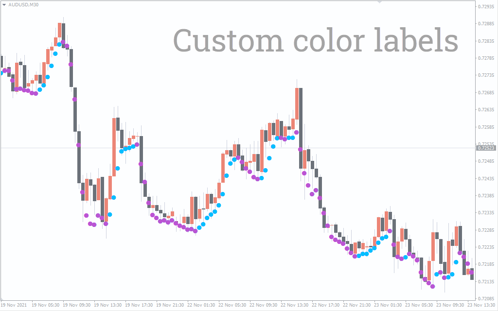 The above AUDUSD M30 price chart shows the Nonlagdot Non Repaint Indicator For MT4 in action. The indicator shows the BULLISH dots in GREEN and the BEARISH dots in RED. The interpretation of the trading signals is pretty simple. The presence of GREEN dots on the price charts indicates a BULLISH market trend. While the presence of RED dots indicates a BEARISH price trend.