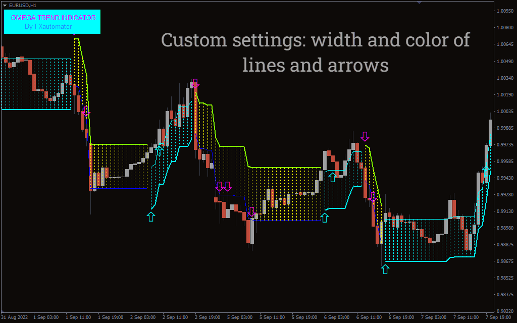 The Omega Trend Indicator draws the pivot lines, histogram, and arrows to tell the direction of the trend. By looking at the indicator’s colors, traders can take their positions. In addition, you can download the indicator for free on our website.