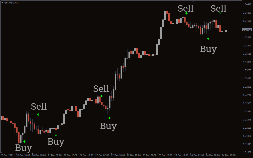 Similarly, forex traders can look for a GREEN down arrow. This arrow shows the beginning of a Bearish price trend so, forex technical traders can take a SELL trade. The SELL trade can be secure with a stop loss above the previous swing high. However, forex traders can look to exit the position with profit with an opposite trading signal as it indicates the end of the Bearish market trend.