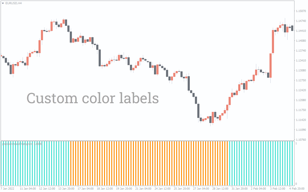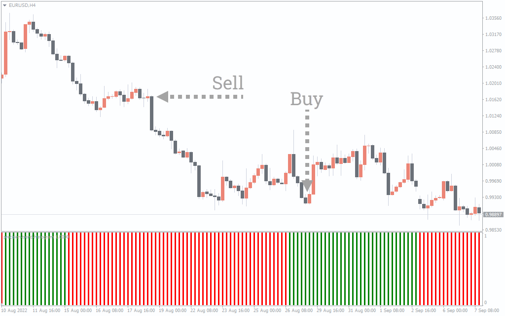 The above EUR/USD H4 chart shows the indicator BUY and SELL signals. To look for BUY and SELL signals, traders need to look at the color of the bars. The indicator plots red bars in a strong downtrend, and traders can enter short positions. Conversely, when the indicator draws green bars, it indicates an uptrend, and traders can enter long positions.