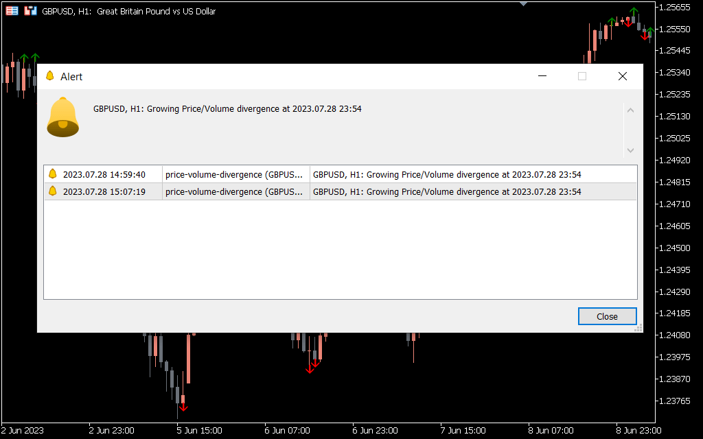 The screenshot above shows how the indicator will look on your MT5 chart. It also illustrates how to identify volume divergence. In addition, the indicator is recommended to be used in sync with price action/or other technical indicators for optimal trade entry.