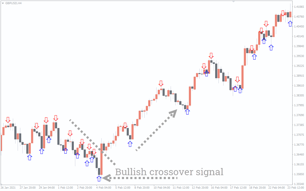 A blue arrow signal suggests the fast MA has exceeded the slow MA, plotting a bullish crossover signal. Once you get a bullish trend confirmation, look for relevant price action signals like price breakouts at resistance or rejections at support.