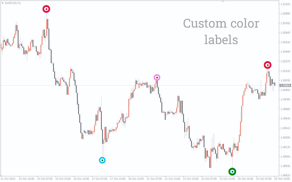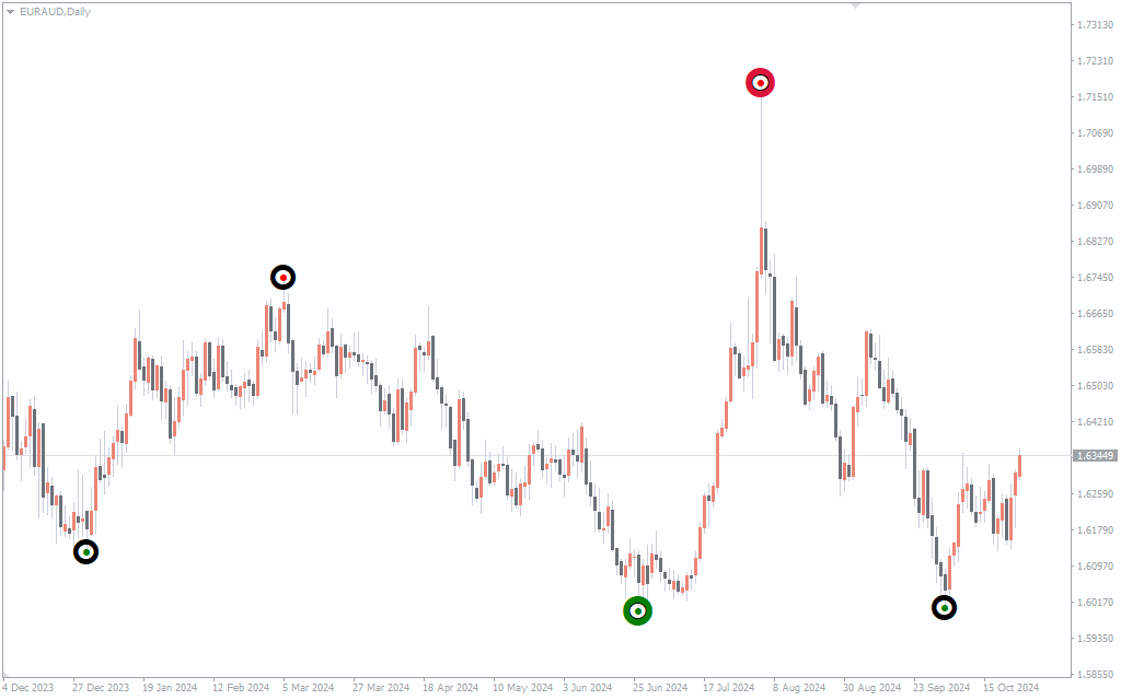 The Sniper Indicator generates trading signals through its visual markers. A green circle at the bottom of a price dip indicates a potential buy signal, suggesting the market may reverse and start an upward trend. Conversely, a red circle at the top of a price peak signifies a potential sell signal, indicating that the market may turn downwards.