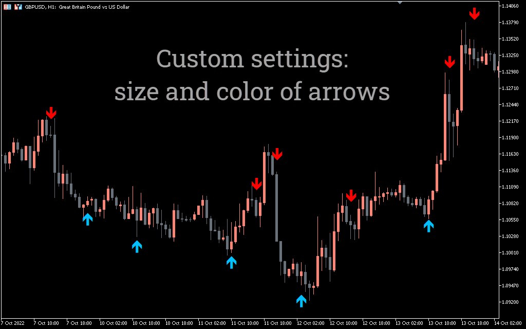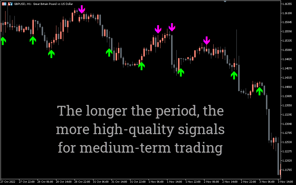 Thanks to simple arrow signals, the indicator is very easy to use for Forex trading. Green arrows indicate a bullish trend, while purple arrows indicate a bearish trend.
