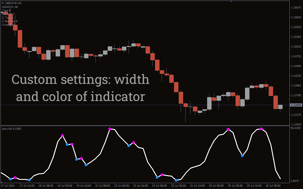 The indicator plots a teal oscillator line in a separate indicator window. The peaks are in majenta dots and the bottoms are in blue. For instance, if the oscillator values reach the top or bottom, it indicates a potential reversal of price.