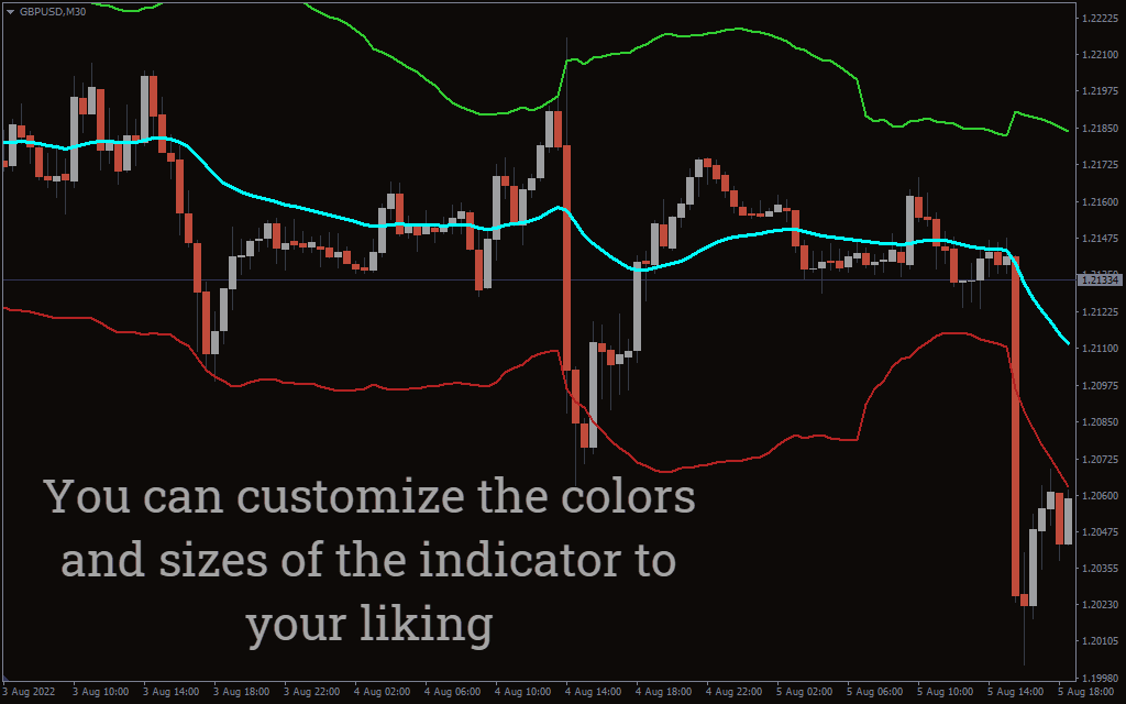 The indicator comes with two yellow bands (upper and lower) that act as a dynamic boundary to gauge the movement and fluctuation of the price of an asset. Conversely, the magenta band (middle) of the indicator functions as a trend divider; the price above/below the magenta band is a bullish/bearish trend, respectively.