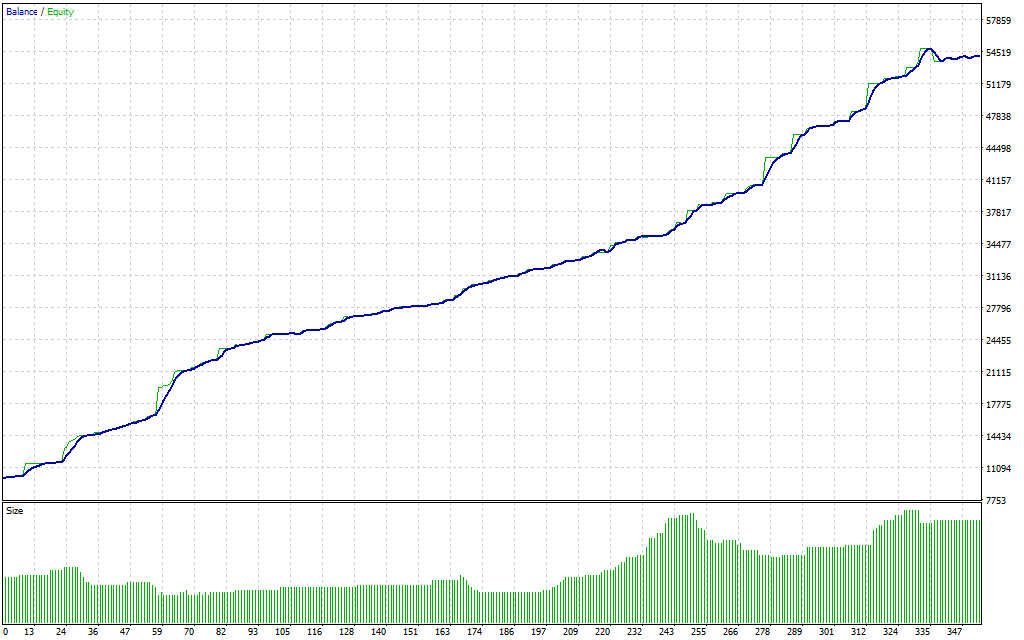 During backtests, the EA showed steady profit accumulation with minimal high-drawdown events, indicating good balance between aggressiveness and safety.