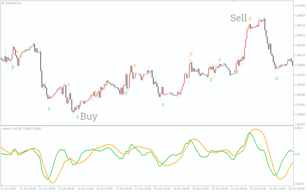The Velocity Arrows indicator for MT4 shows the average speed at which the price rises or falls. It allows traders to see how fast or slow the price moves in a particular direction. The indicator uses a fast and slow moving average to display the velocity at the bottom of the screen. Moreover, it gives clear buy and sell signals with arrows on the chart.