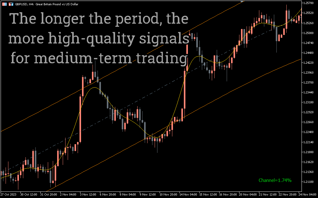 The VHP Channel indicator consists of two lines: one central and two outer bands. The central line is a smoothed KAMA modified according to the direction of the trend.