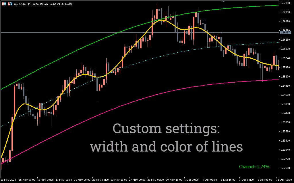 The VHP Channel indicator has several uses. You can, for example, use it to determine the direction of the trend by observing the slope of the center line. You can also look for pullbacks into the bands or breakouts outside the bands to find potential trading opportunities.