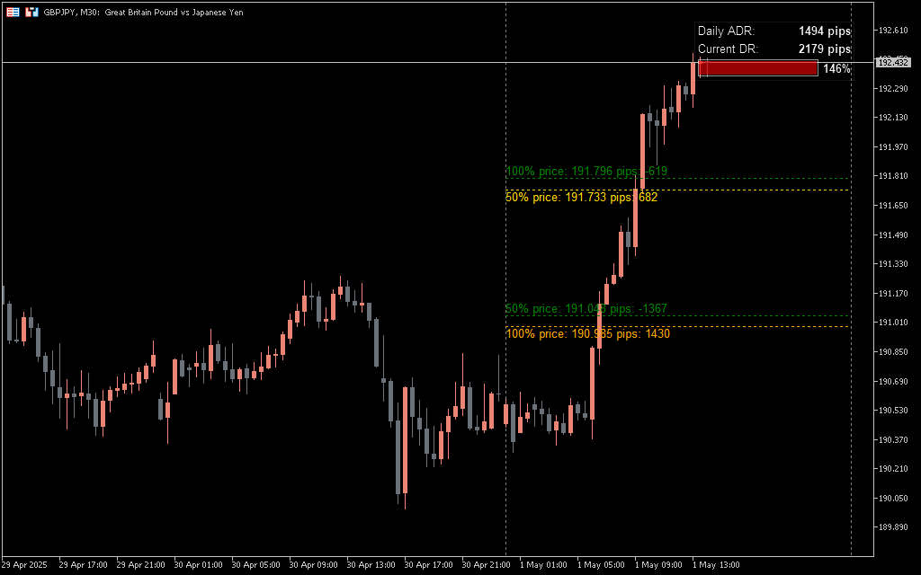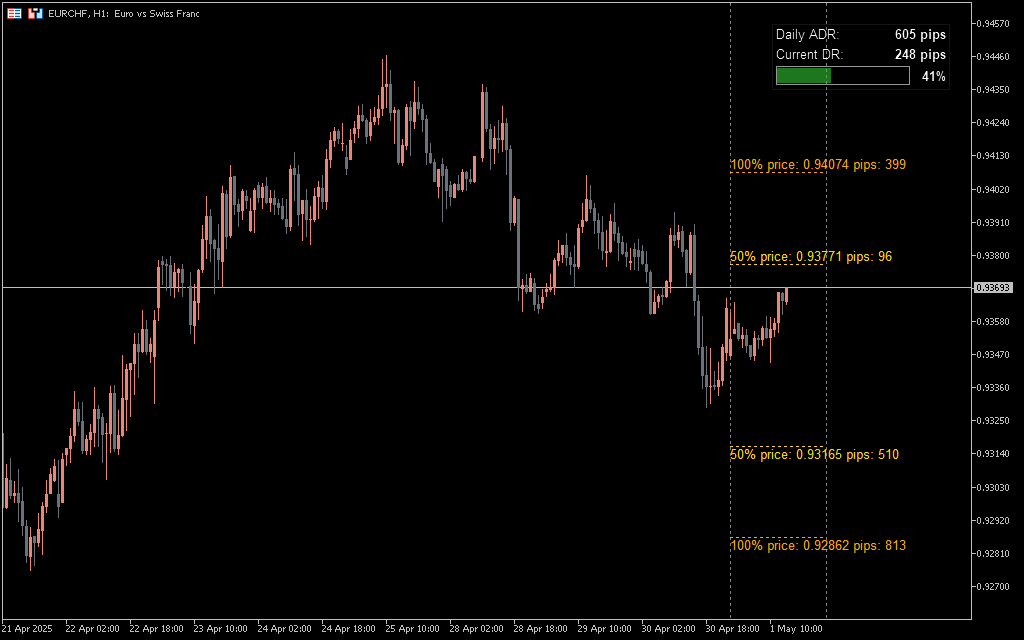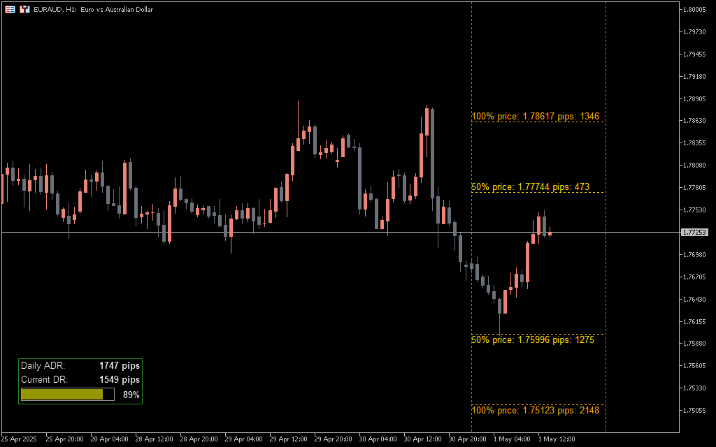 The ADR Bar Indicator for MT5 is a clean, informative, and highly adaptable tool for measuring and visualizing the daily price range. Whether you’re scalping, day trading, or swing trading, it helps you plan your trades more effectively by identifying potential exhaustion zones and high-probability areas.
