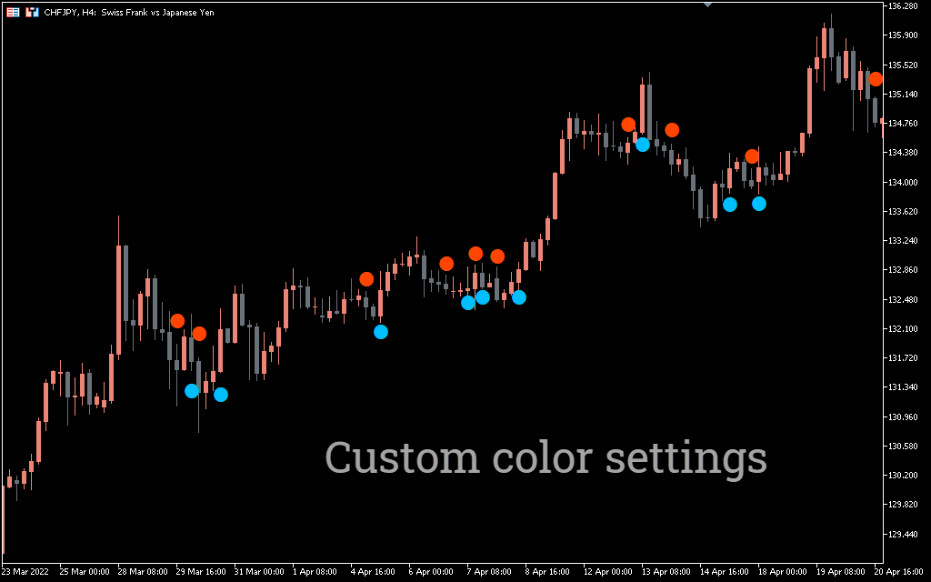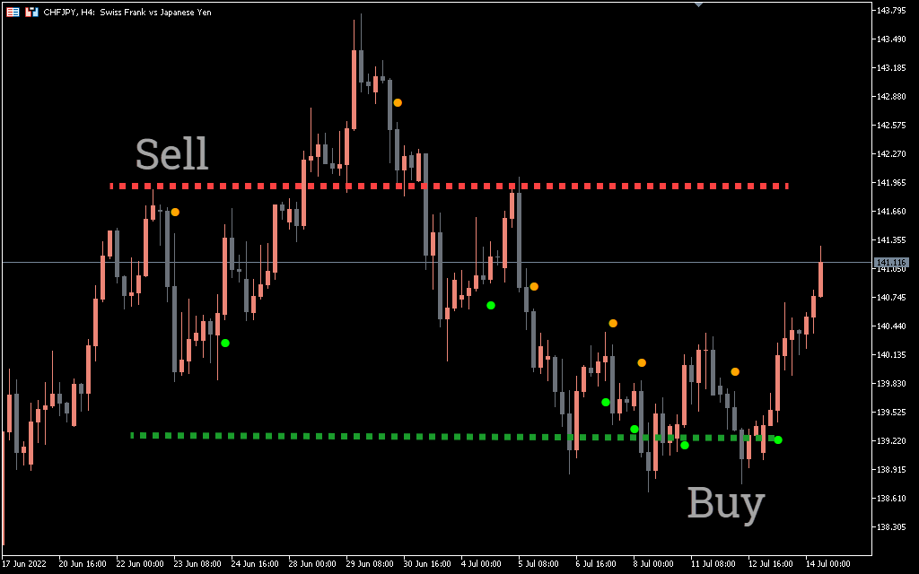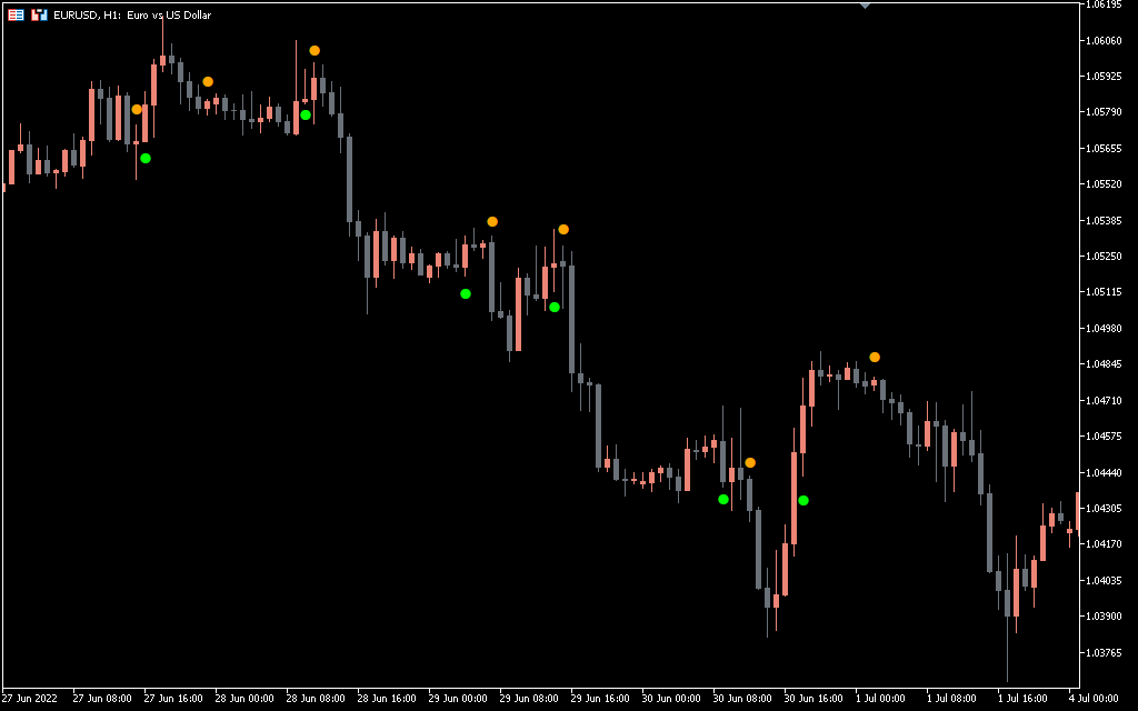 In the chart above, the orange dots are sell signals. On the contrary, green dots are buy signals.