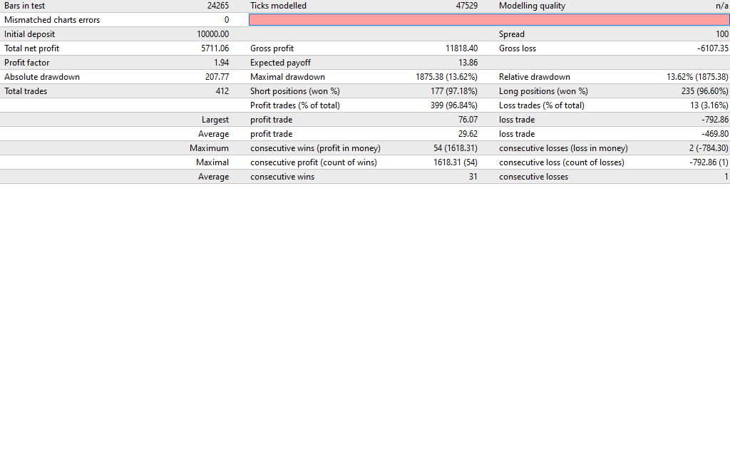 The EA created $5,711.06 of net profit in the strategy tester, where the initial deposit of $10,000 was used. The profit factor is 1.94 followed by a relative drawdown of 13.62%, which is relatively controlled for gold trading. Over 412 trades overall, the win rate was higher than 96%, indicating excellent internal filtering.