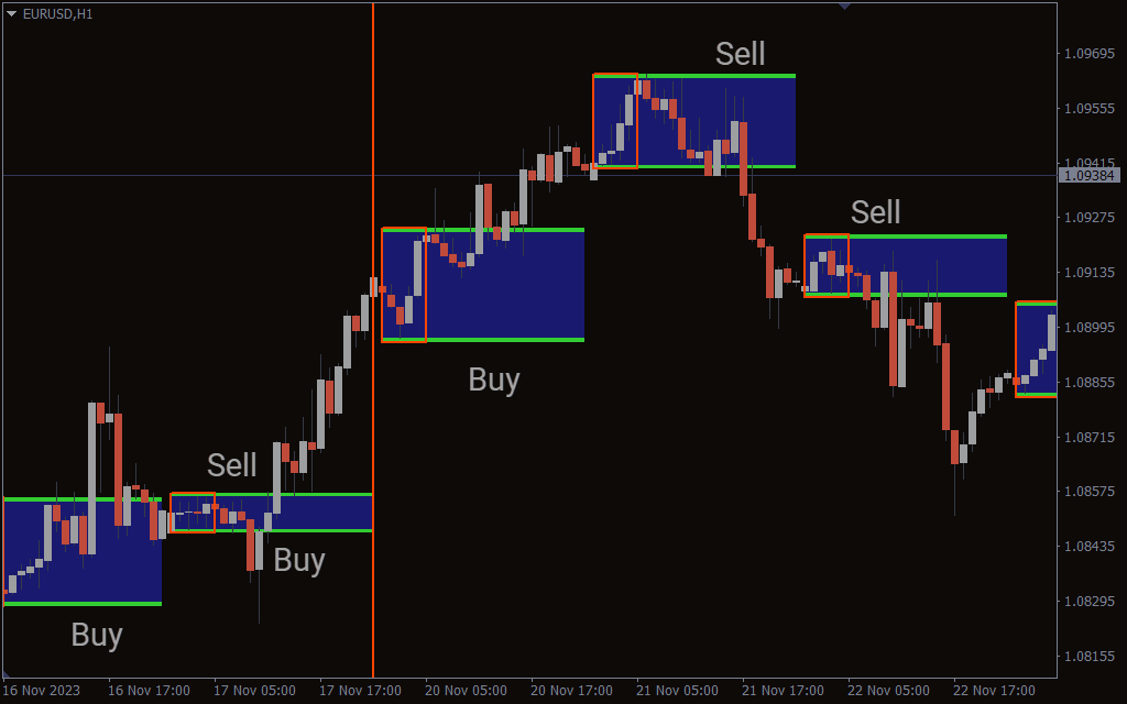 The indicator plots box period till 0.00 to 5.30 as red, while the whole box from 0.00 to 23.00 is green, with the high and low prices marked with blue. According to the indicator the high and low prices during the Asian trading session between 0.00 and 5.30 forms the base for the rest of the trading day. As a result, in this strategy the high acts as resistance and the low acts as support.