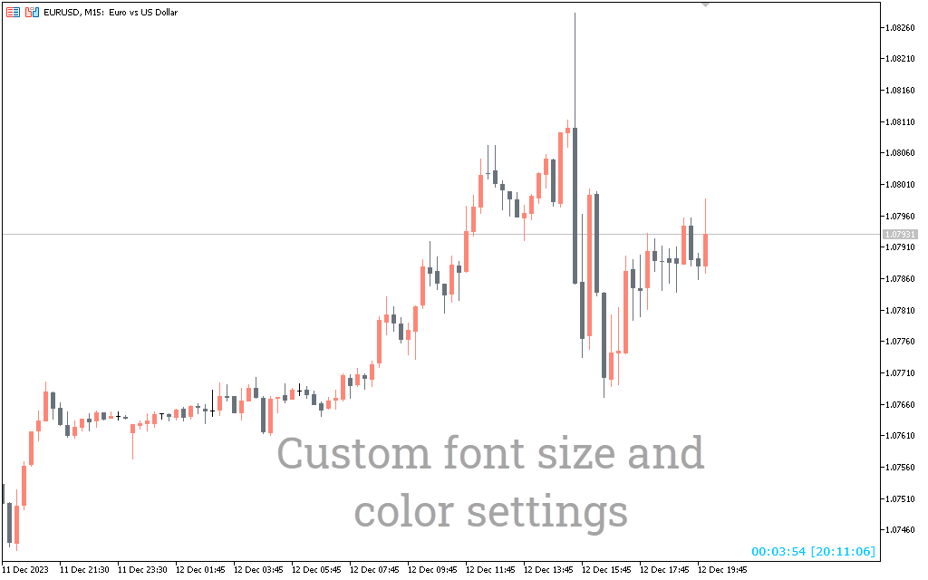 The indicator displays the time in gray in the corner of the chart set in the entry settings. It updates automatically, ensuring that traders always have access to real-time candle life information. This feature proves especially useful for forex scalpers who are looking to capitalize on small price movements. Scalpers are often looking to get in and out of the market quickly, and having an accurate understanding of the time remaining before a candle can play an important role in their decision-making process.