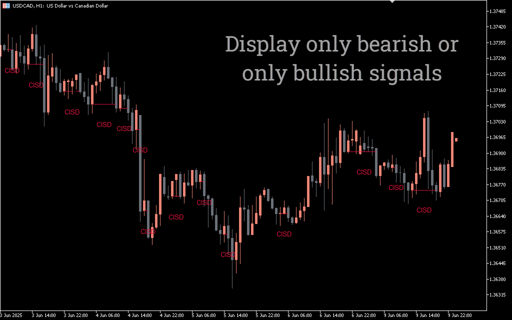 The CISD indicator plots real-time labels that highlight significant transitions in delivery state. A teal “C|SD” label marks a bullish shift where demand overtakes supply, often followed by upward momentum. Conversely, a crimson “C|SD” label indicates a bearish transition, pointing to a possible shift in favor of sellers. These changes usually occur after a defined swing structure is broken or invalidated, signaling a likely reversal or continuation depending on market context. Additional gray markers indicate sweep events that provide extra confluence when analyzing liquidity or stop-run activity.
